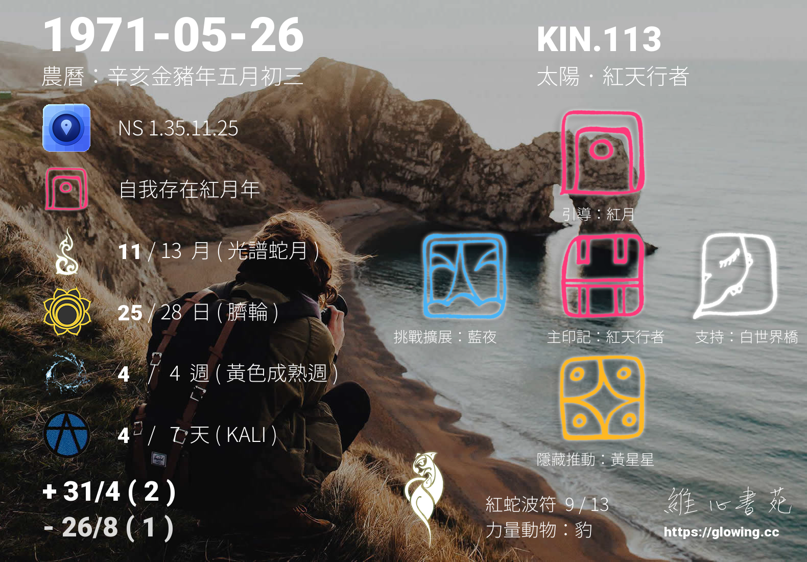 我們可以稱 KIN 113 為 【太陽紅天行者】 、 【太陽的紅天行者】 、 【紅蛇波符 之 太陽紅天行者】 也可以是 【太陽紅天行者.紅蛇波符】 ,你比較喜歡哪一個稱號呢?