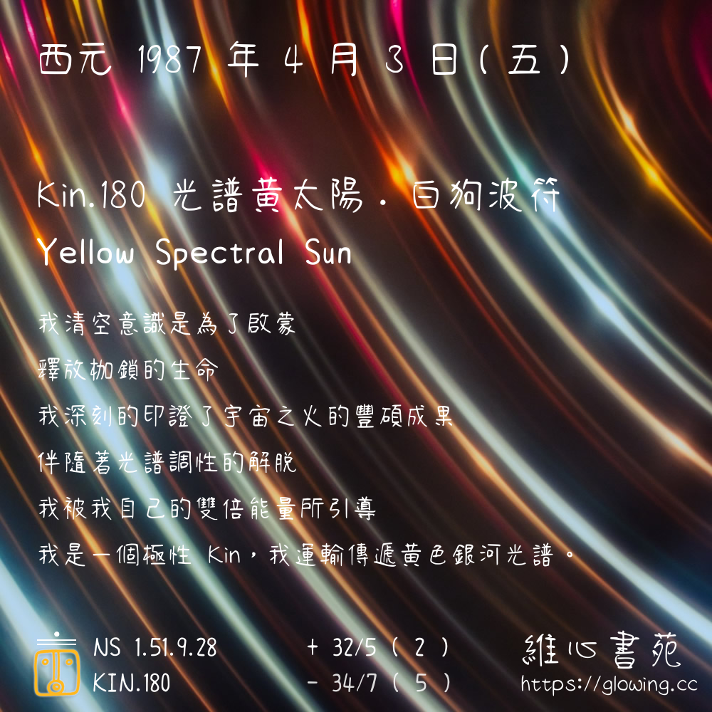 我們可以稱 KIN 180 為 【光譜黃太陽】 、 【光譜的黃太陽】 、 【白狗波符 之 光譜黃太陽】 也可以是 【光譜黃太陽.白狗波符】 ,你比較喜歡哪一個稱號呢?