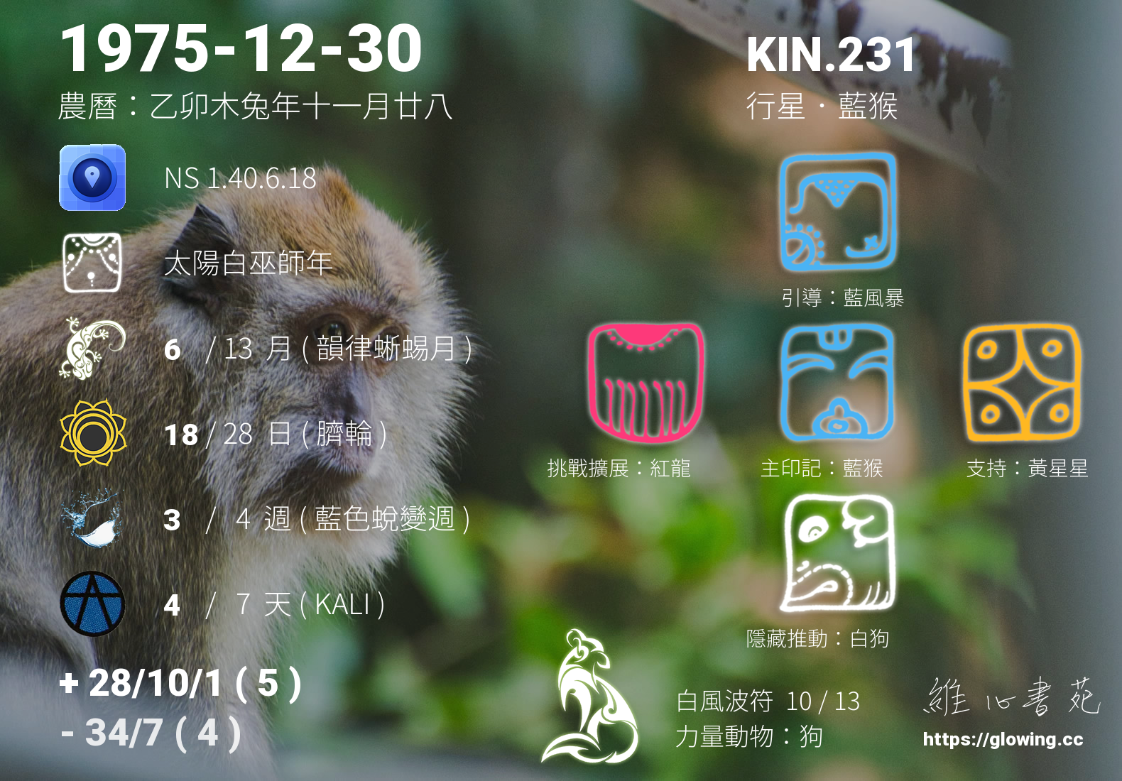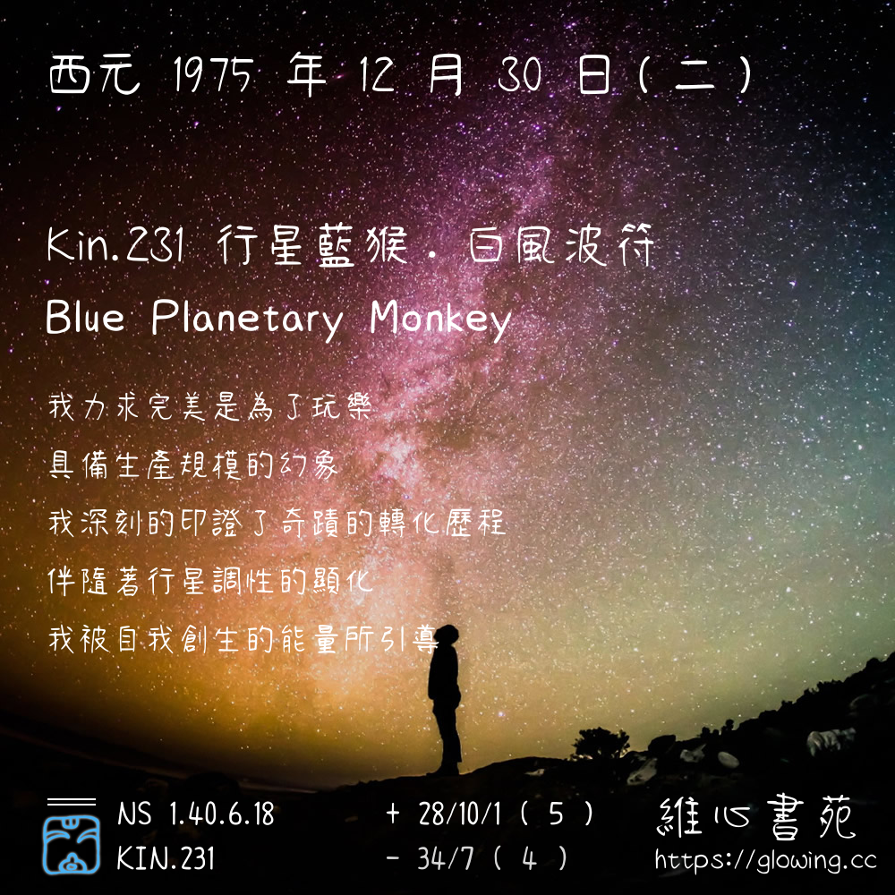 我們可以稱 KIN 231 為 【行星藍猴】 、 【行星的藍猴】 、 【白風波符 之 行星藍猴】 也可以是 【行星藍猴.白風波符】 ,你比較喜歡哪一個稱號呢?