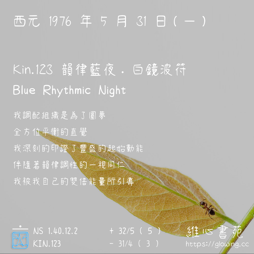 我們可以稱 KIN 123 為 【韻律藍夜】 、 【韻律的藍夜】 、 【白鏡波符 之 韻律藍夜】 也可以是 【韻律藍夜.白鏡波符】 ,你比較喜歡哪一個稱號呢?