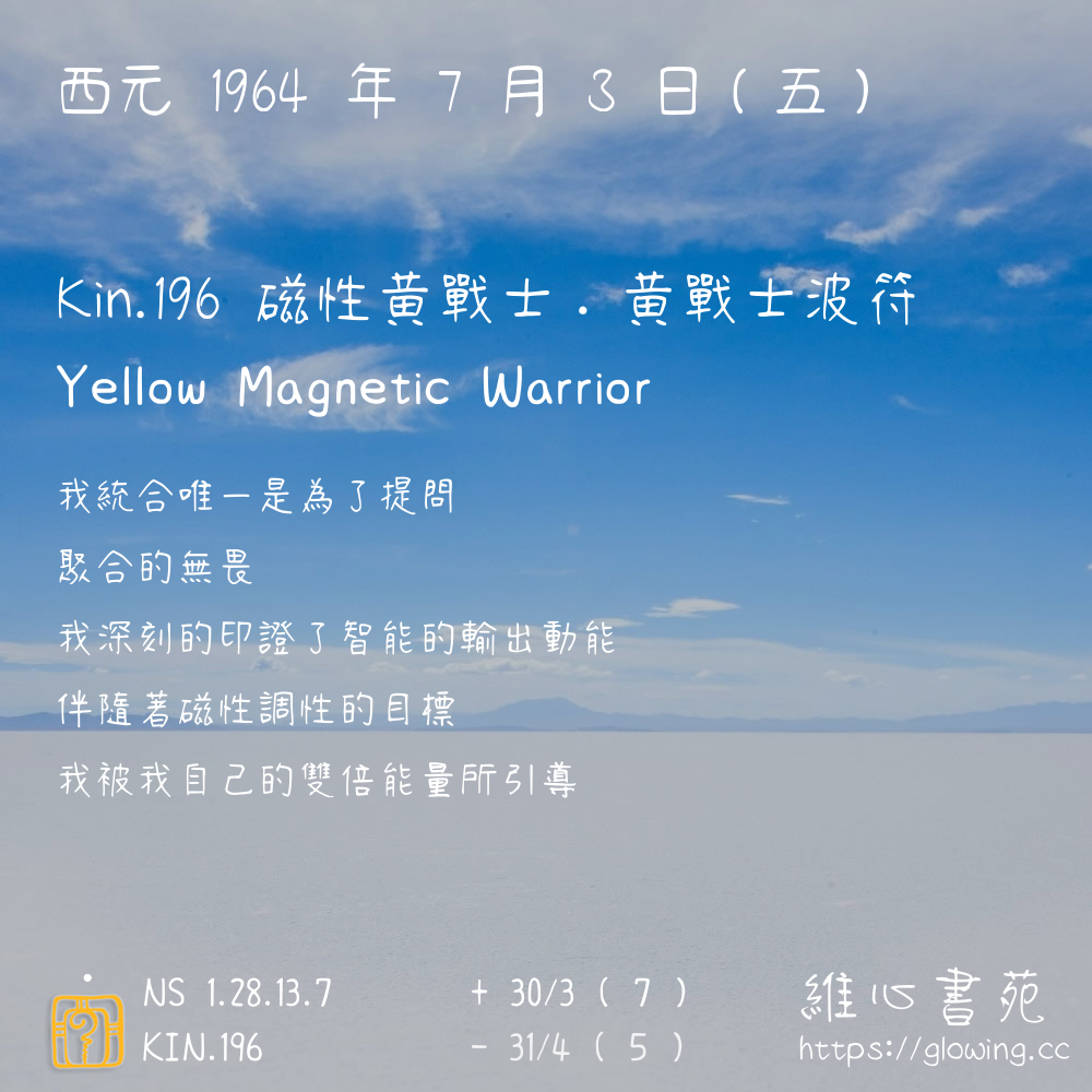 我們可以稱 KIN 196 為 【磁性黃戰士】 、 【磁性的黃戰士】 、 【黃戰士波符 之 磁性黃戰士】 也可以是 【磁性黃戰士.黃戰士波符】 ,你比較喜歡哪一個稱號呢?