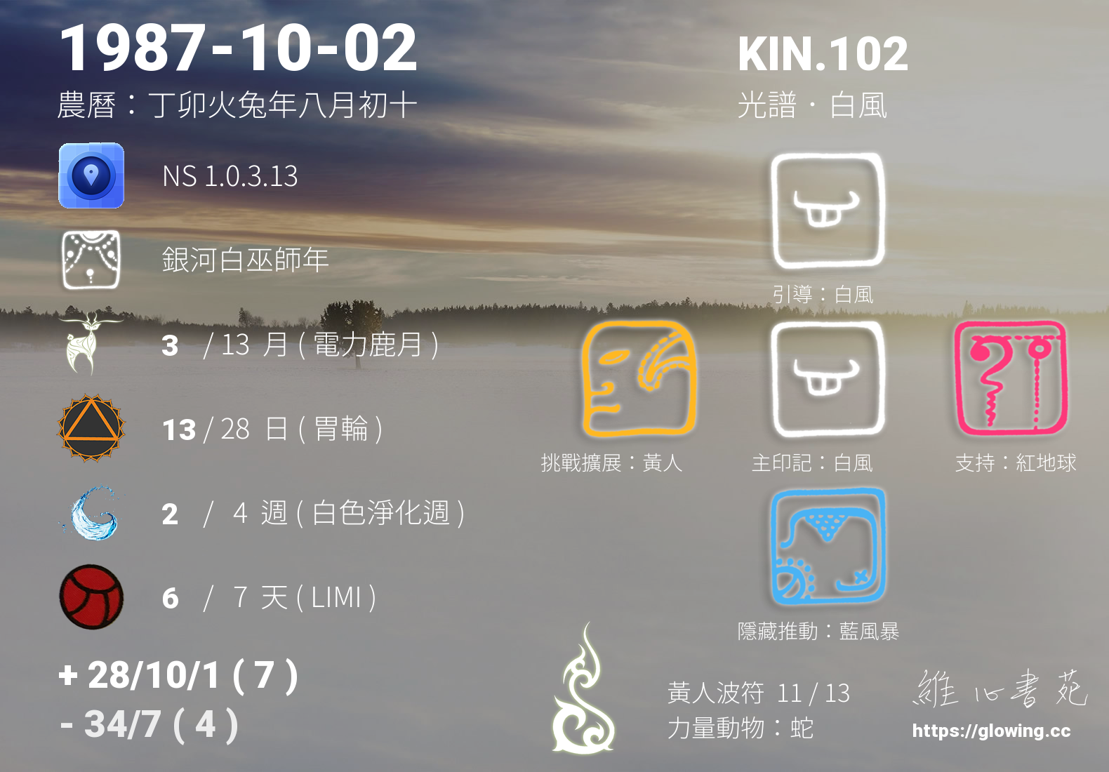 我們可以稱 KIN 102 為 【光譜白風】 、 【光譜的白風】 、 【黃人波符 之 光譜白風】 也可以是 【光譜白風.黃人波符】 ,你比較喜歡哪一個稱號呢?