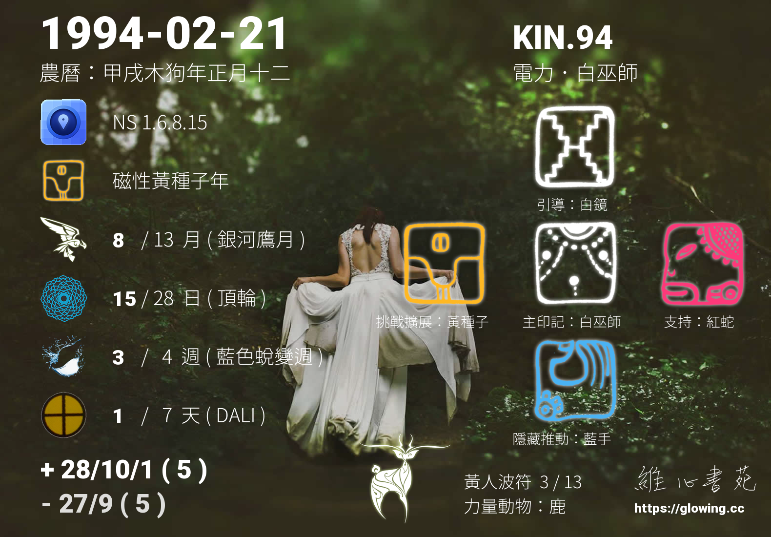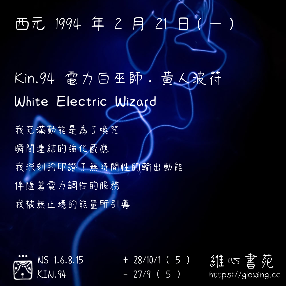我們可以稱 KIN 94 為 【電力白巫師】 、 【電力的白巫師】 、 【黃人波符 之 電力白巫師】 也可以是 【電力白巫師.黃人波符】 ,你比較喜歡哪一個稱號呢?