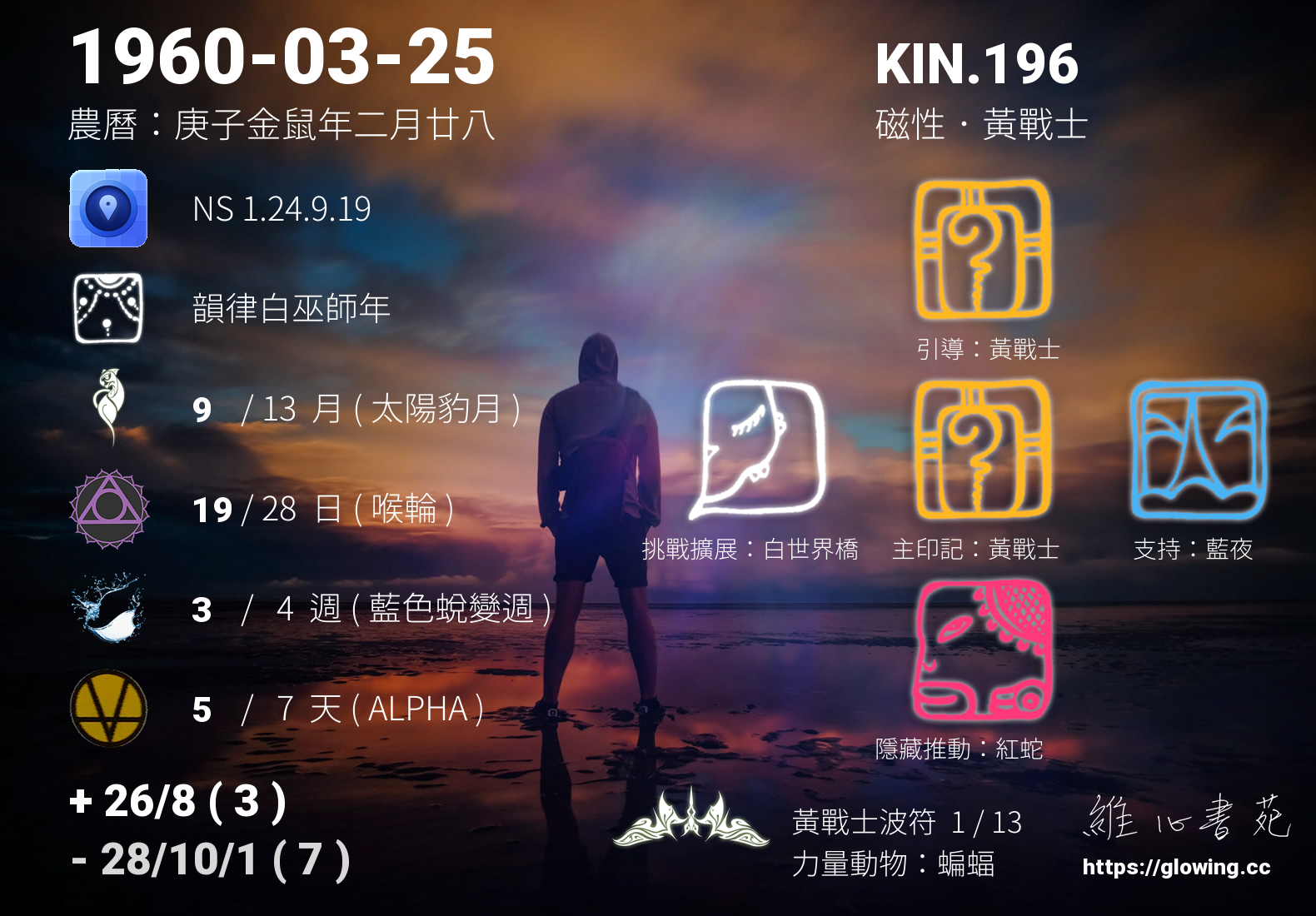 黃戰士的引導依據KIN的調性不同會有五種可能性,KIN.196的引導圖騰是黃戰士 , 黃戰士引導著我們勇敢無懼地去實現夢想,所有的夢想都需要時間去成就,在一步步的突破中我們需要無比的勇氣,黃戰士的無畏提供我們滋糧,讓我們堅實挺立不畏風霜,終將取得豐碩的成果。