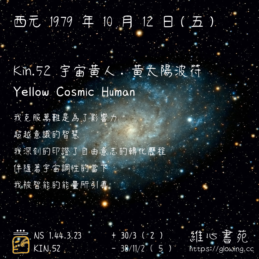 我們可以稱 KIN 52 為 【宇宙黃人】 、 【宇宙的黃人】 、 【黃太陽波符 之 宇宙黃人】 也可以是 【宇宙黃人.黃太陽波符】 ,你比較喜歡哪一個稱號呢?