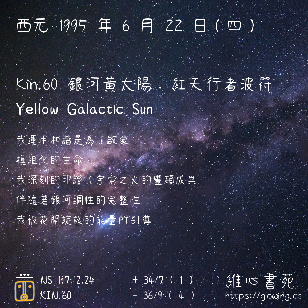 我們可以稱 KIN 60 為 【銀河黃太陽】 、 【銀河的黃太陽】 、 【紅天行者波符 之 銀河黃太陽】 也可以是 【銀河黃太陽.紅天行者波符】 ,你比較喜歡哪一個稱號呢?