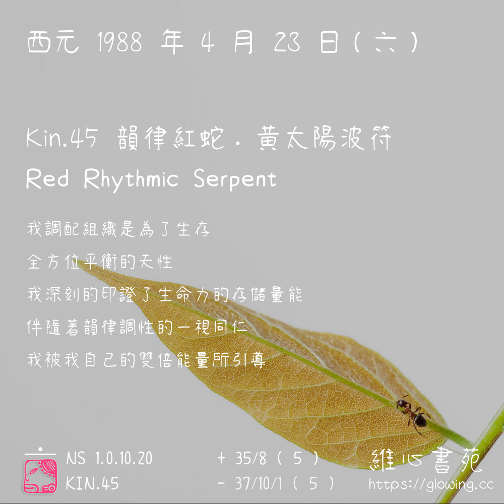 我們可以稱 KIN 45 為 【韻律紅蛇】 、 【韻律的紅蛇】 、 【黃太陽波符 之 韻律紅蛇】 也可以是 【韻律紅蛇.黃太陽波符】 ,你比較喜歡哪一個稱號呢?