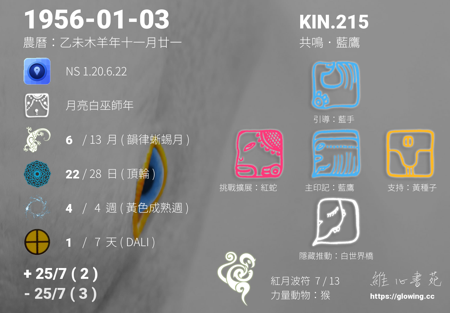 我們可以稱 KIN 215 為 【共鳴藍鷹】 、 【共鳴的藍鷹】 、 【紅月波符 之 共鳴藍鷹】 也可以是 【共鳴藍鷹.紅月波符】 ,你比較喜歡哪一個稱號呢?
