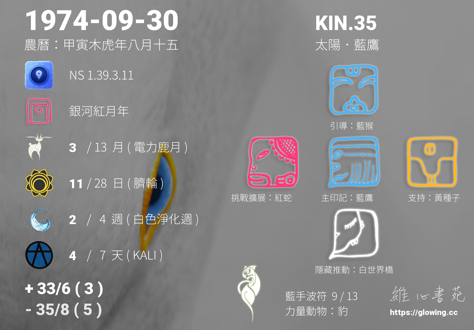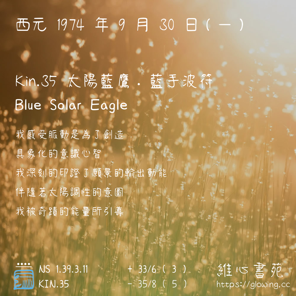 我們可以稱 KIN 35 為 【太陽藍鷹】 、 【太陽的藍鷹】 、 【藍手波符 之 太陽藍鷹】 也可以是 【太陽藍鷹.藍手波符】 ,你比較喜歡哪一個稱號呢?
