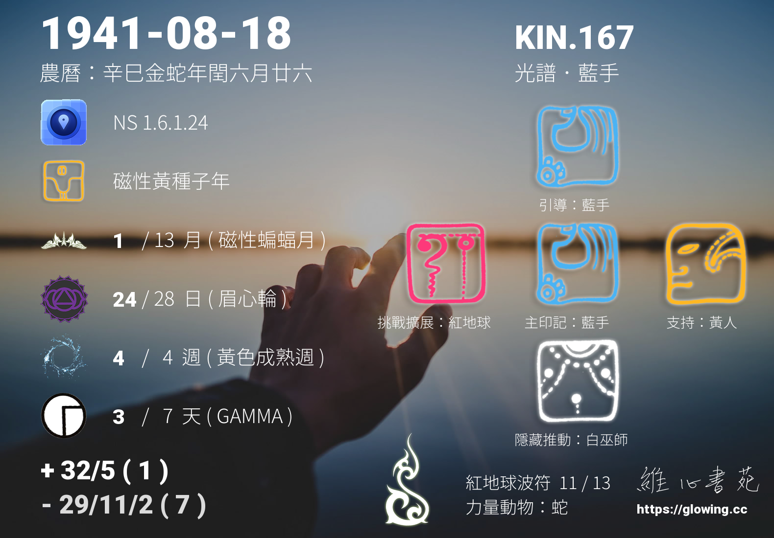 我們可以稱 KIN 167 為 【光譜藍手】 、 【光譜的藍手】 、 【紅地球波符 之 光譜藍手】 也可以是 【光譜藍手.紅地球波符】 ,你比較喜歡哪一個稱號呢?