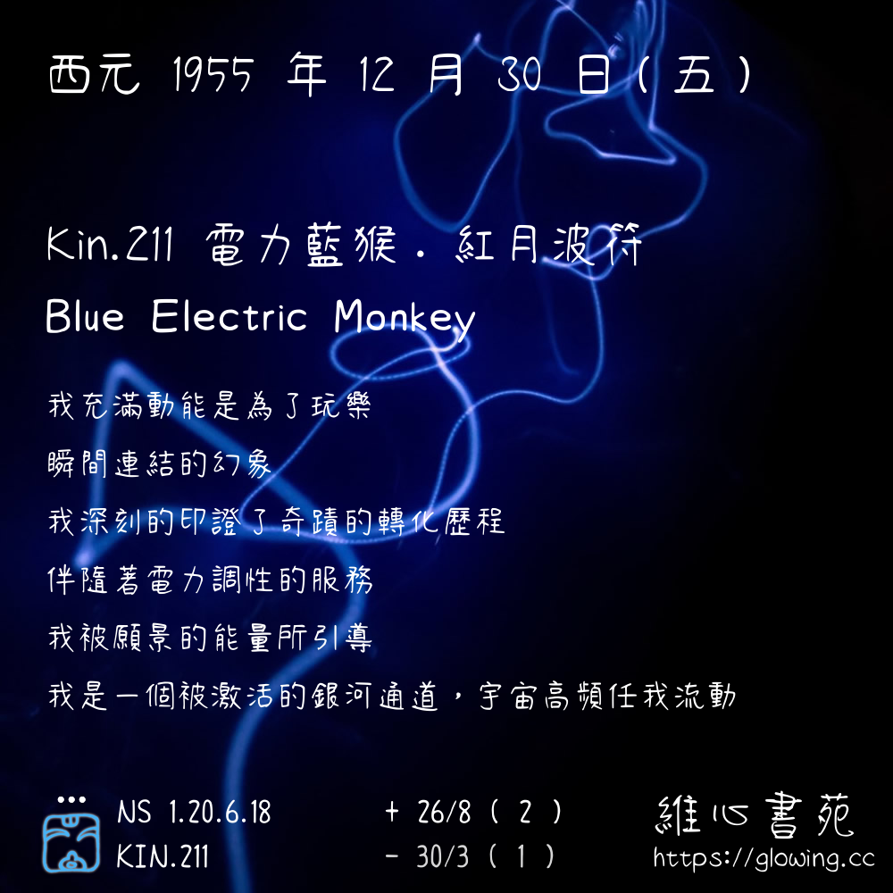 我們可以稱 KIN 211 為 【電力藍猴】 、 【電力的藍猴】 、 【紅月波符 之 電力藍猴】 也可以是 【電力藍猴.紅月波符】 ,你比較喜歡哪一個稱號呢?