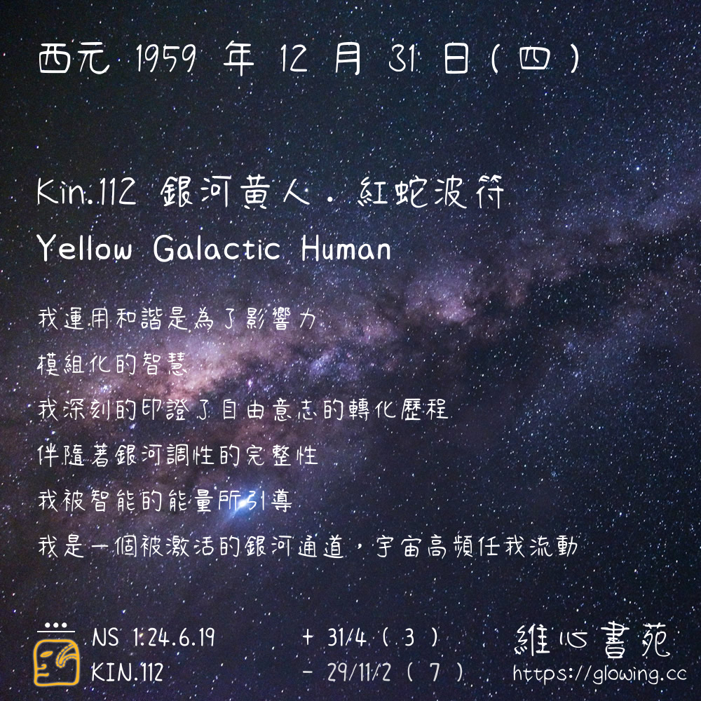 我們可以稱 KIN 112 為 【銀河黃人】 、 【銀河的黃人】 、 【紅蛇波符 之 銀河黃人】 也可以是 【銀河黃人.紅蛇波符】 ,你比較喜歡哪一個稱號呢?