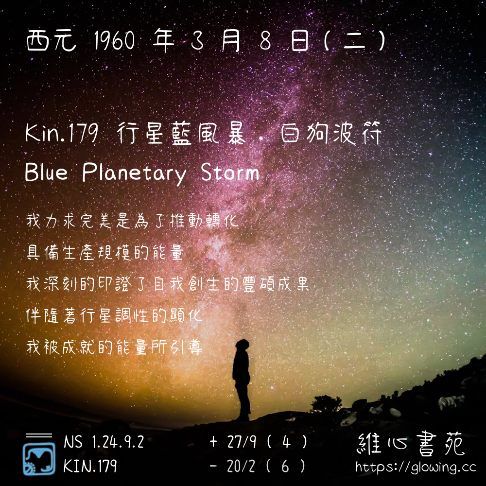 我們可以稱 KIN 179 為 【行星藍風暴】 、 【行星的藍風暴】 、 【白狗波符 之 行星藍風暴】 也可以是 【行星藍風暴.白狗波符】 ,你比較喜歡哪一個稱號呢?