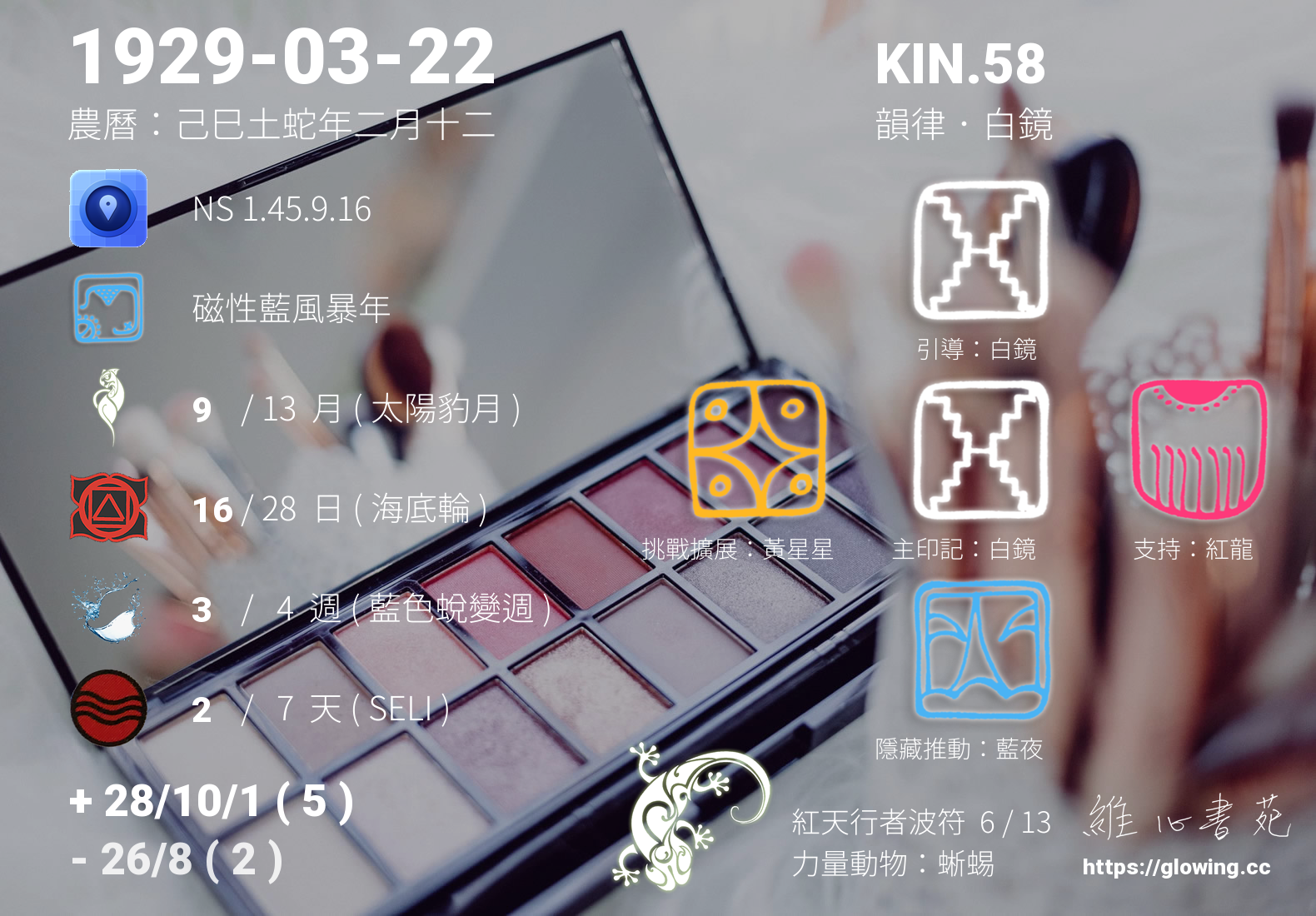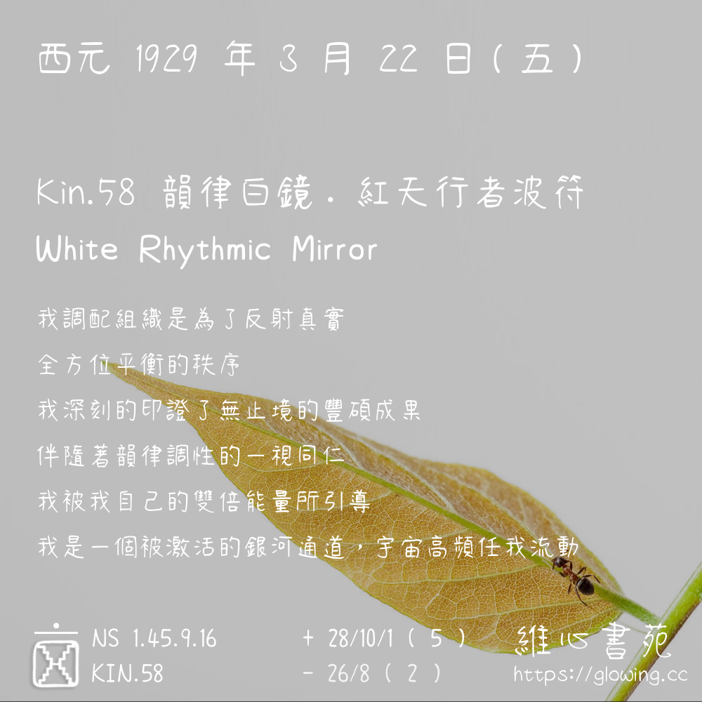 我們可以稱 KIN 58 為 【韻律白鏡】 、 【韻律的白鏡】 、 【紅天行者波符 之 韻律白鏡】 也可以是 【韻律白鏡.紅天行者波符】 ,你比較喜歡哪一個稱號呢?