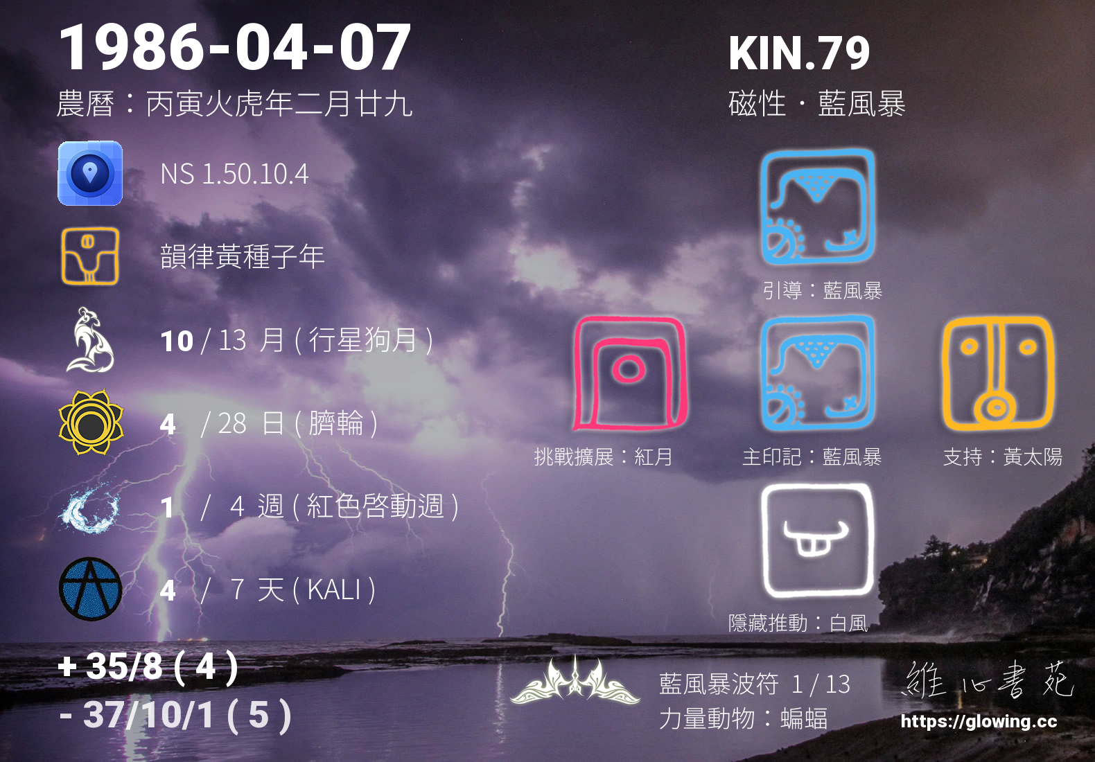 KIN.79 位於 藍風暴波符 13 天中的第 1 天,銀河音階為調性 1
