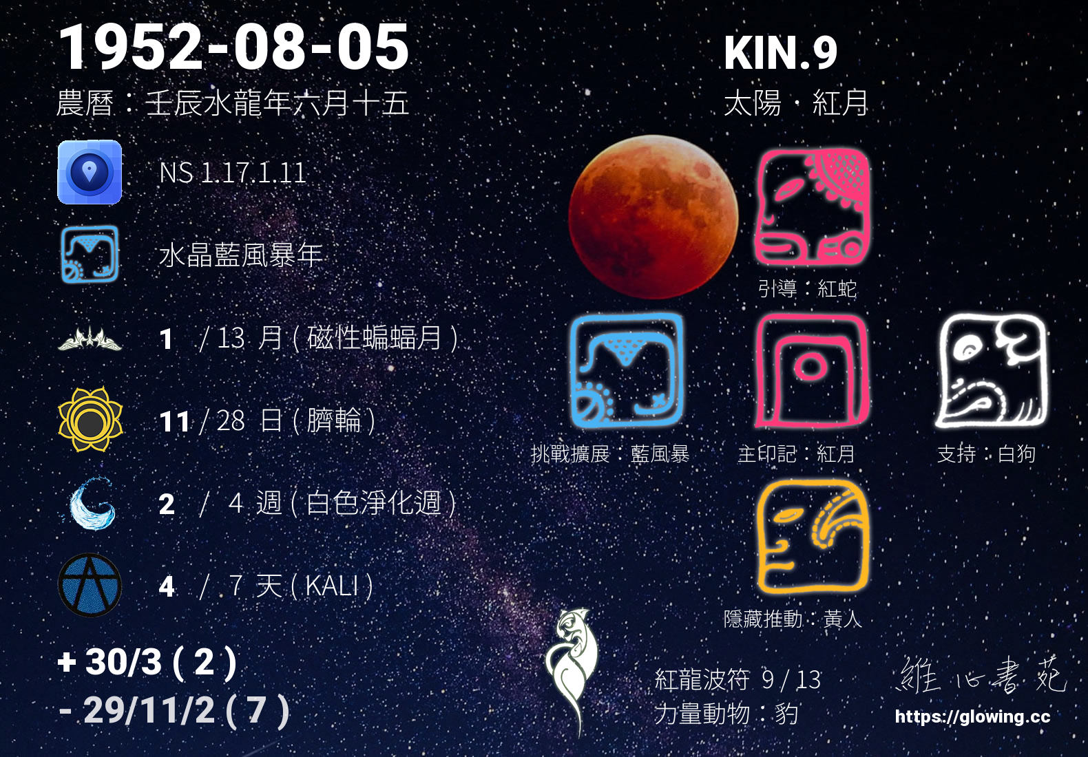KIN.9 位於 紅龍波符 13 天中的第 9 天,銀河音階為調性 9