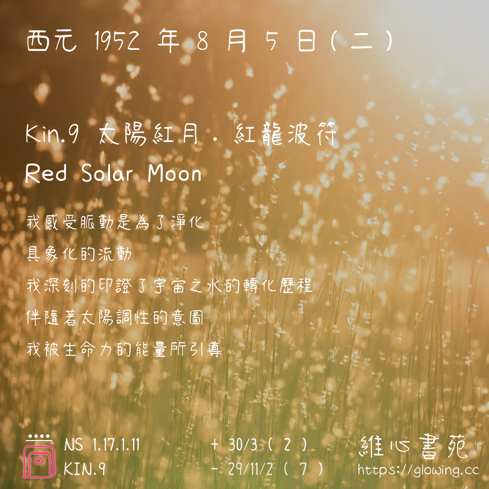我們可以稱 KIN 9 為 【太陽紅月】 、 【太陽的紅月】 、 【紅龍波符 之 太陽紅月】 也可以是 【太陽紅月.紅龍波符】 ,你比較喜歡哪一個稱號呢?